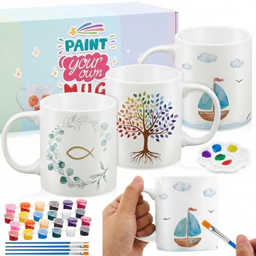Sinmoe 4 Paquets Kit Mug à Peindre avec Tasses en Céramique à Peindre, Peintures, Pinceaux Kit Peinture sur Mug à Personnaliser Soi-Même Tasse en Porcelaine Vierges Matériel Créatif pour Adultes
