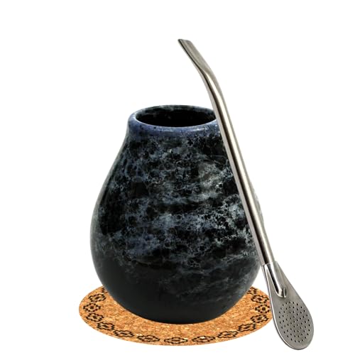 Gaucho Yerba Maté et Calebasse ● Gobelet à thé marmol bleu 350 ml ● Tasse en céramique ● Paille Bombilla en acier inoxydable 19 cm ● Récipient pour maté avec paille ● Tampon en liège