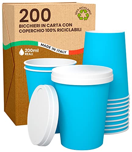 Baciato Caffè 200 Gobelets Carton BLEU pour Café à Emporter - Tasse Jetables 200ml avec Couvercles pour Servir le Thé, Cappuccino, Chocolatdes Boissons Chaudes et Froides