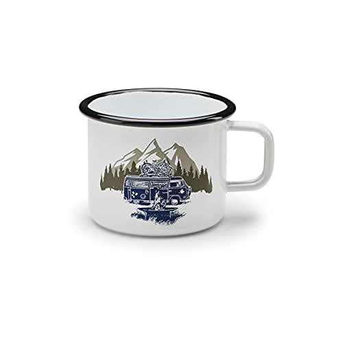 Volkswagen 1H2069601 Tasse en émail blanc VW T1 Heritage « Adventure Awaits » Tasse à café/thé/tasse à café/tasse à thé pour la maison, le bureau, les voyages, le camping - 500 ml