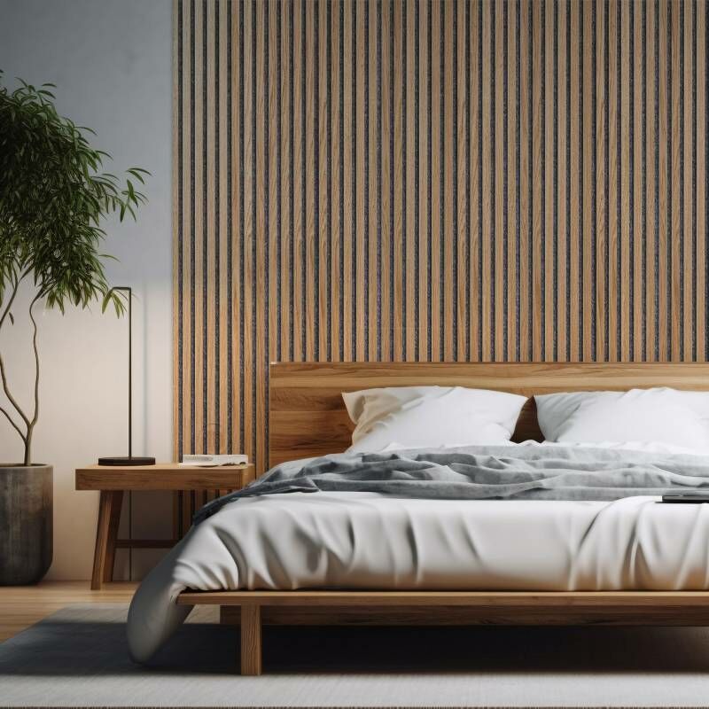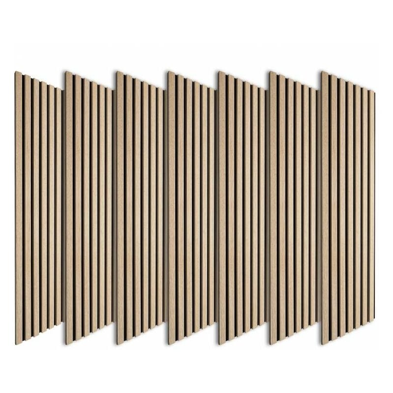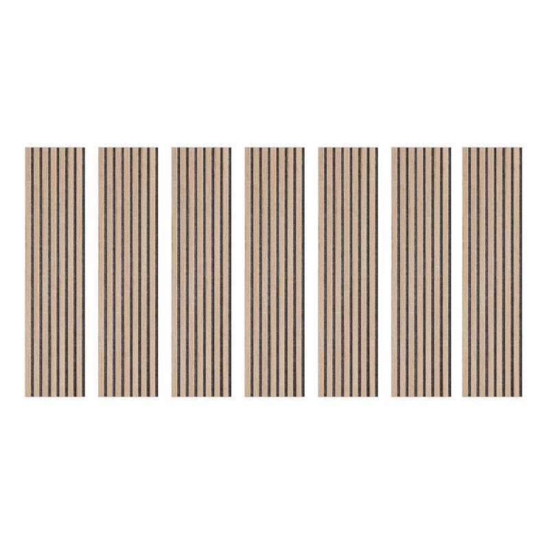 Decoon - Lot de 7 Panneaux muraux tasseaux bois 120x30x1 cm - Pack tête de lit 160 - Lamelles chêne clair véritable fond noir 2,52 m²