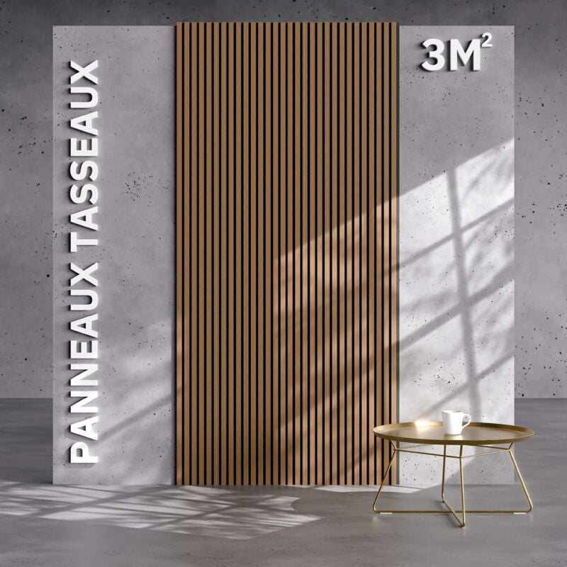 Decoon - Panneau tasseaux bois 250 x 30 x 1cm - Lamelles chêne clair véritable fond gris - 0,75m²