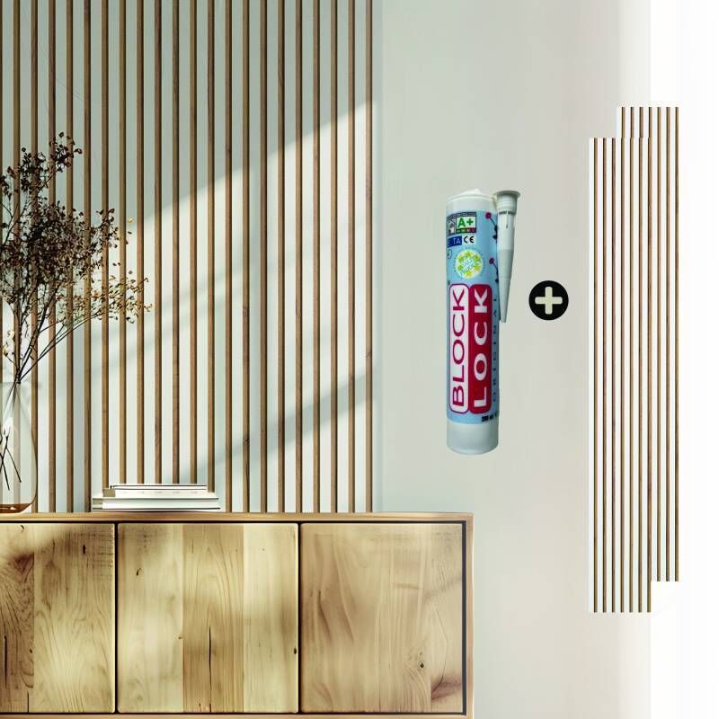Lot de 2 Panneaux tasseaux bois avec colle - 250 x 30 x 1,4 cm décor blanc / fond rigide chêne - 1,5m²