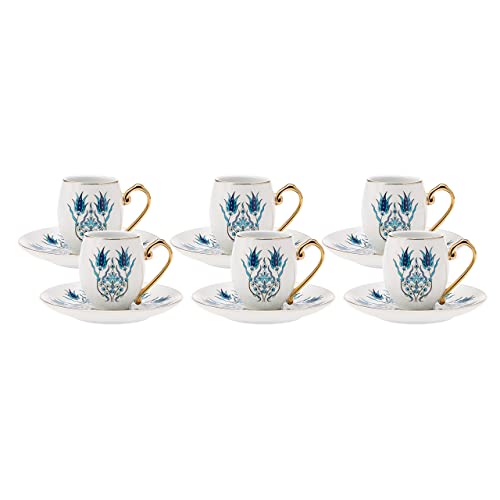 Karaca Iznik Service à café pour 6 personnes -12 pièces, Set de tasses à café traditionnelles turques avec soucoupes, Tasses à espresso, Set de tasses à moka en porcelaine, Cappuccino