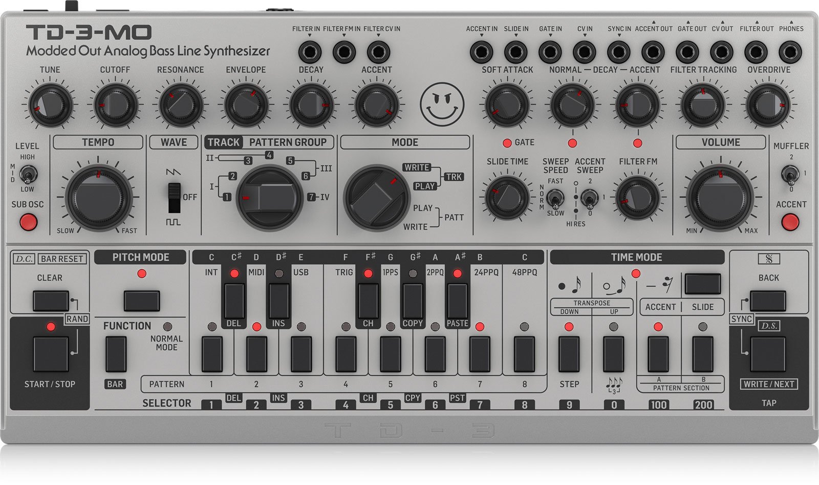 Behringer TD-3-MO-SR Analog Bass Line Synthesizer, 16-Step Sequencer, MIDI via USB, CV/Gate & Sync I/O, Silver