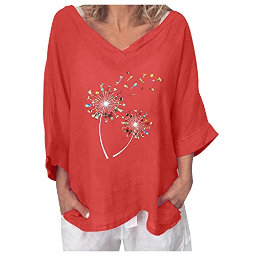 Générique Chemise Femme Chic T-Shirt Ample en Coton et Lin Imprimé, Hauts Chemisier Blouse Décontracté Col V Manches 3/4 pour Femmes, Tunique Tops Tee Shirts Débardeur Casual Grande Taille Pas Cher