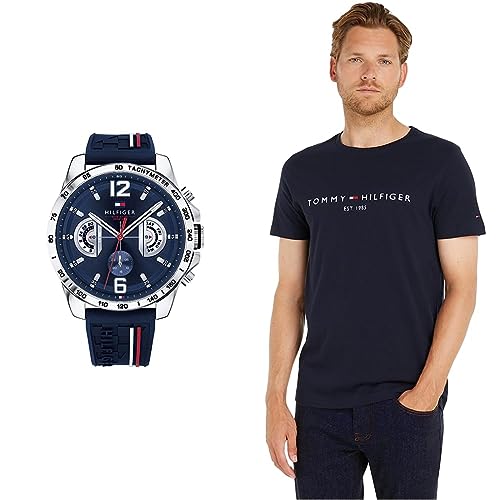 Tommy Hilfiger Montre Analogique Multifunction à Quartz pour Homme avec Bracelet en Silicone Bleu Marin - 1791476 & T-Shirt Homme Core Tommy Logo Tee Encolure Ronde, Bleu (Sky Captain), XL
