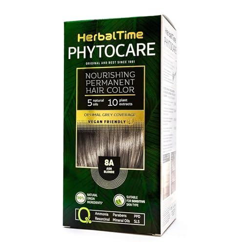 Herbal Time Phytocare Teinture permanente pour cheveux Blond cendré 8A | teinture capillaire naturelle professionnelle | Nourrissez et protégez vos cheveux | Sans ammoniaque, PPD et SLS | 124,5ml