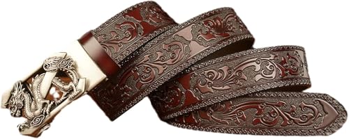 Ceintures en Cuir, Cliquet en Cuir Véritable pour Hommes avec Boucle Automatique Dragon 3D Argenté, Western Vintage Décontracté Gravé 1-3/8 Pouces De Large, Coffee, 125cm/waist:42"~44