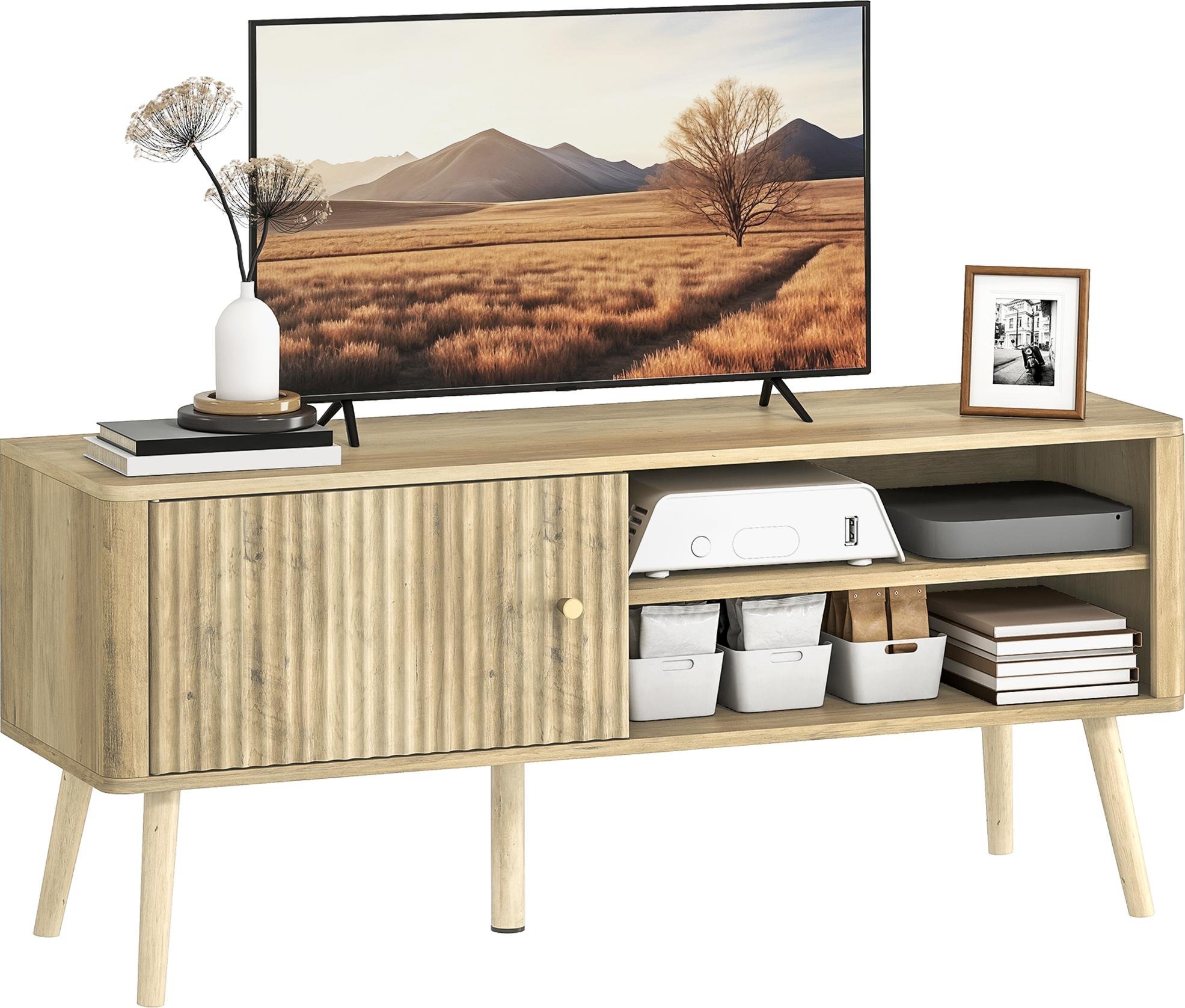 HOMCOM Meuble TV 115 cm, meuble télé pour téléviseur jusqu'à 55 pouces avec placard à porte, compartiments ouverts et étagère réglable, pieds en pin, banc TV pour salon, chambre à coucher, chêne