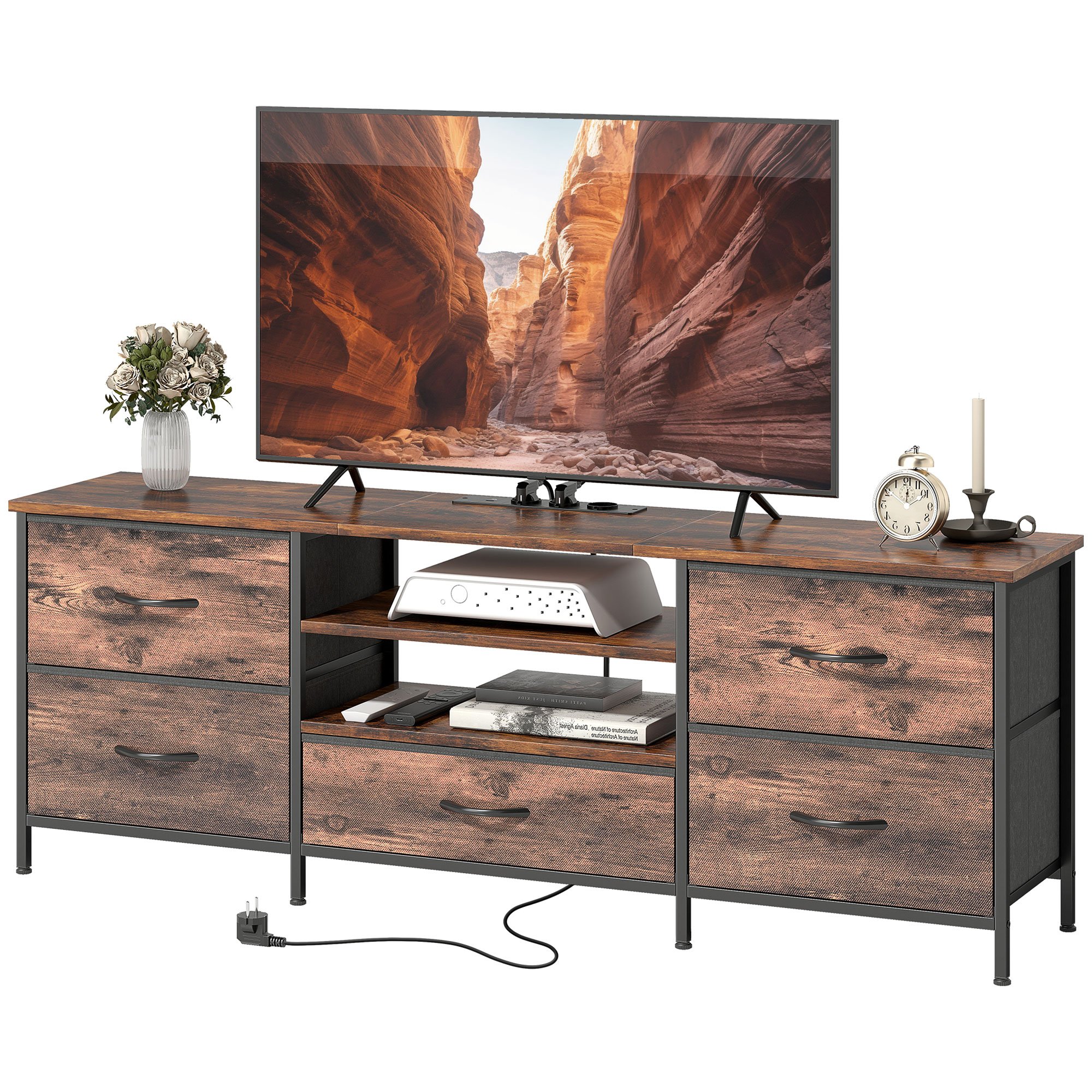 HOMCOM Meuble TV 140 cm, meuble télé 65 pouces, station de charge, 5 tiroirs en tissu, étagères ouvertes, 140x30x50cm, marron