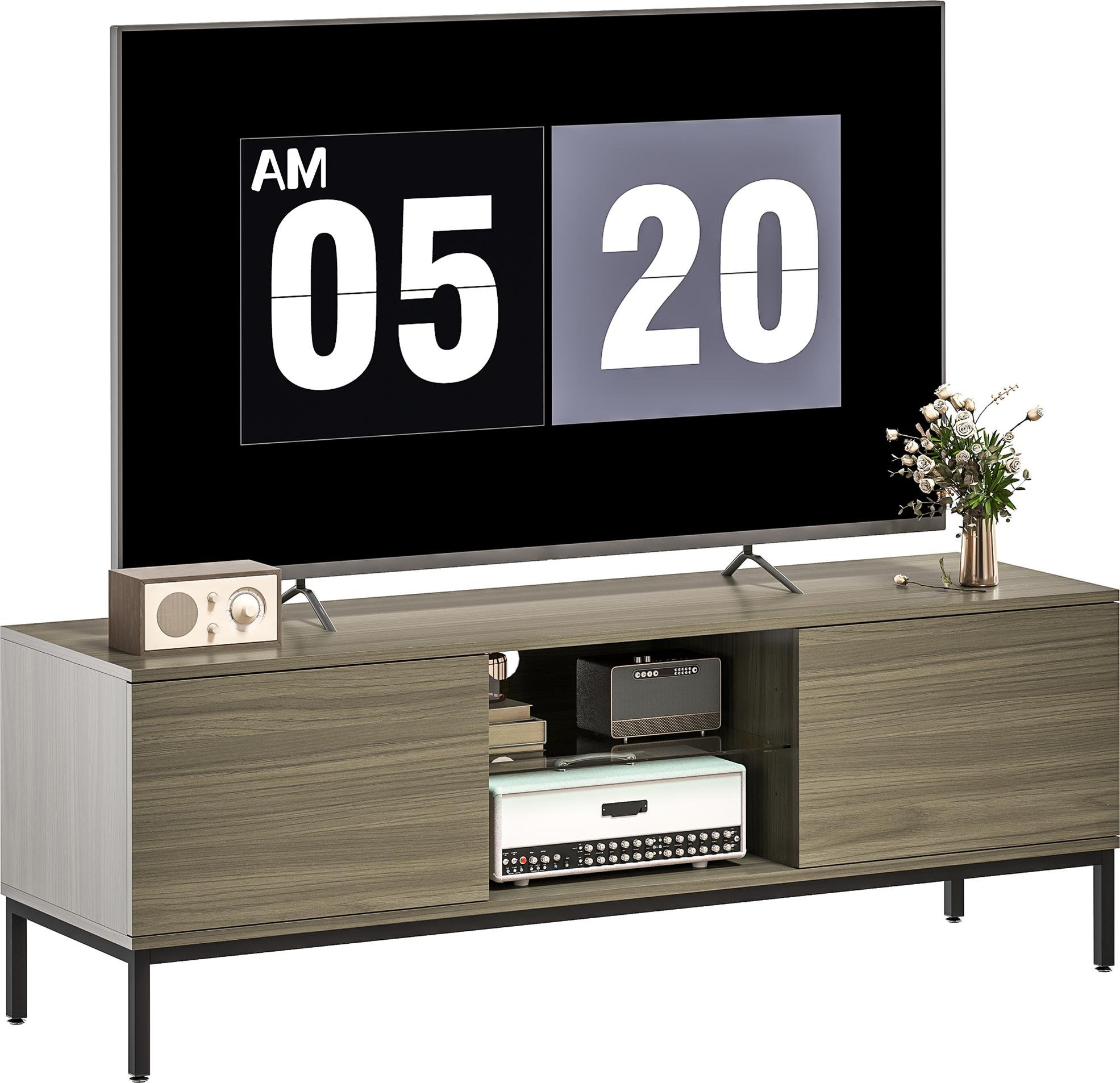 HOMCOM Meuble TV 140 cm, meuble télé pour téléviseur jusqu'à 60 pouces avec 2 portes et étagère en verre réglable, banc TV moderne pour salon, chambre à coucher, gris