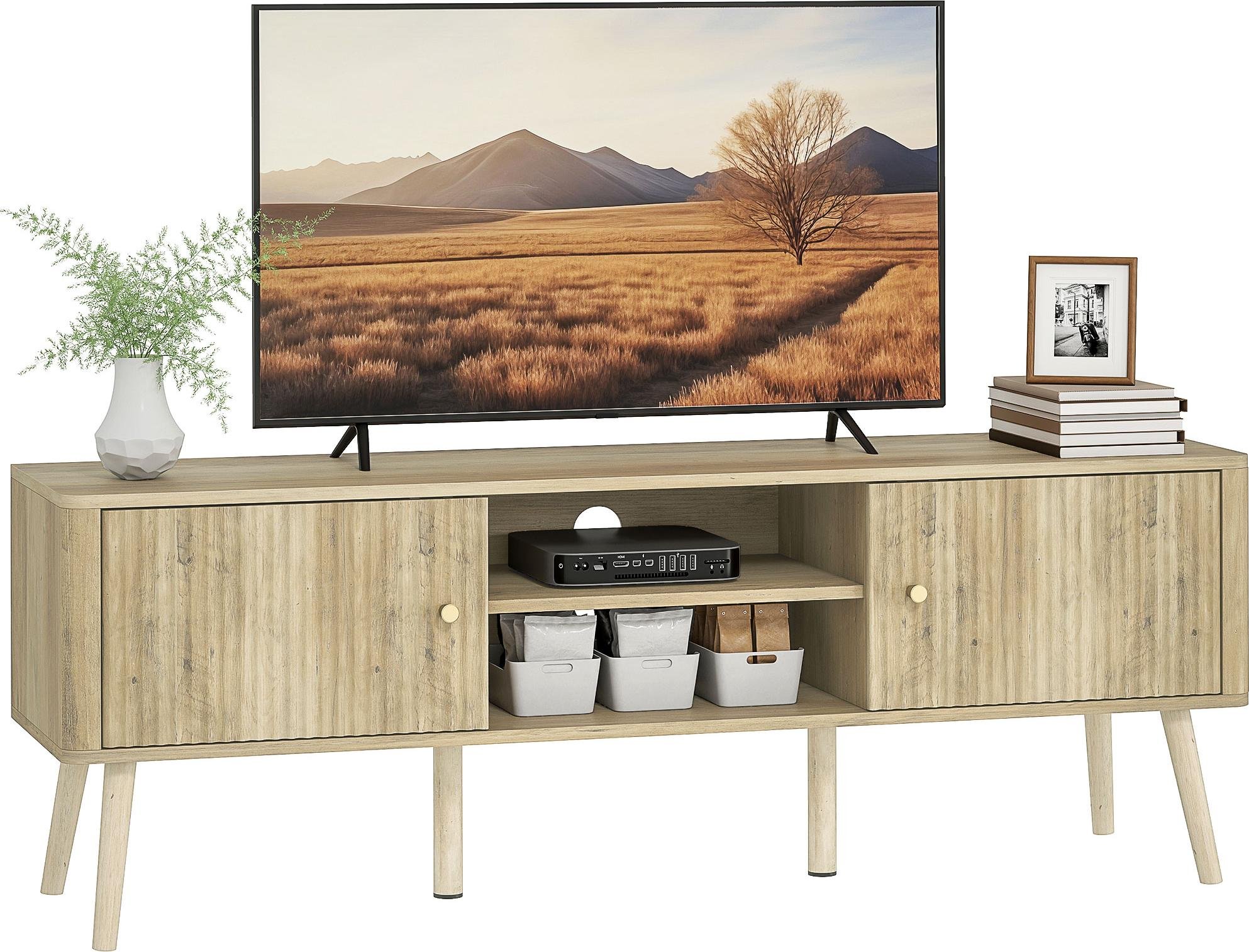 HOMCOM Meuble TV 140 cm, meuble télé pour téléviseur jusqu'à 65 pouces avec 2 portes, 2 compartiments ouverts, étagère réglable et pieds en pin, banc TV pour salon, chambre à coucher, chêne