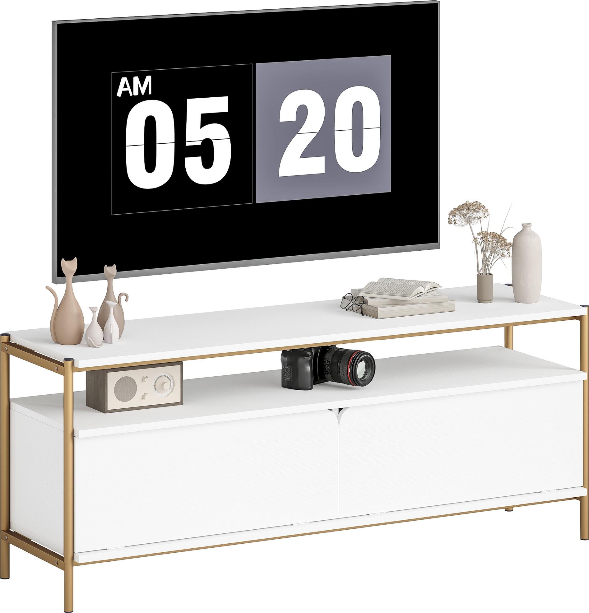 HOMCOM Meuble TV meuble télé pour téléviseur jusqu'à 55 pouces avec 2 portes rabattables et étagère ouverte, cadre en acier, banc TV moderne pour salon chambre à coucher, 124 x 35 x 50 cm, blanc