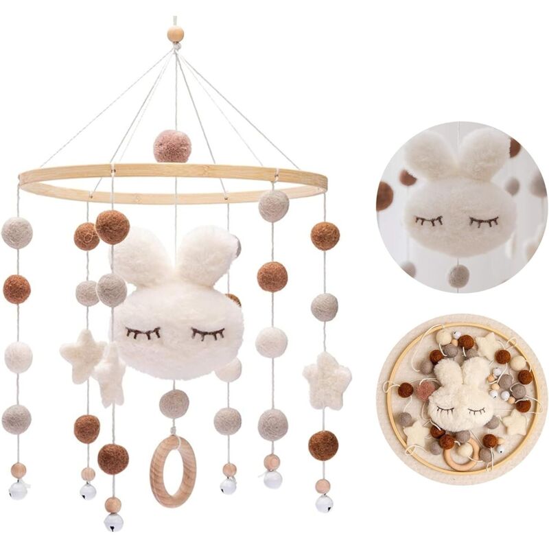 Téléphone bébé en bois avec boule en feutre à suspendre pour chambre d'enfant, lapin, carillon éolien mobile pour berceau (blanc) - Ahlsen