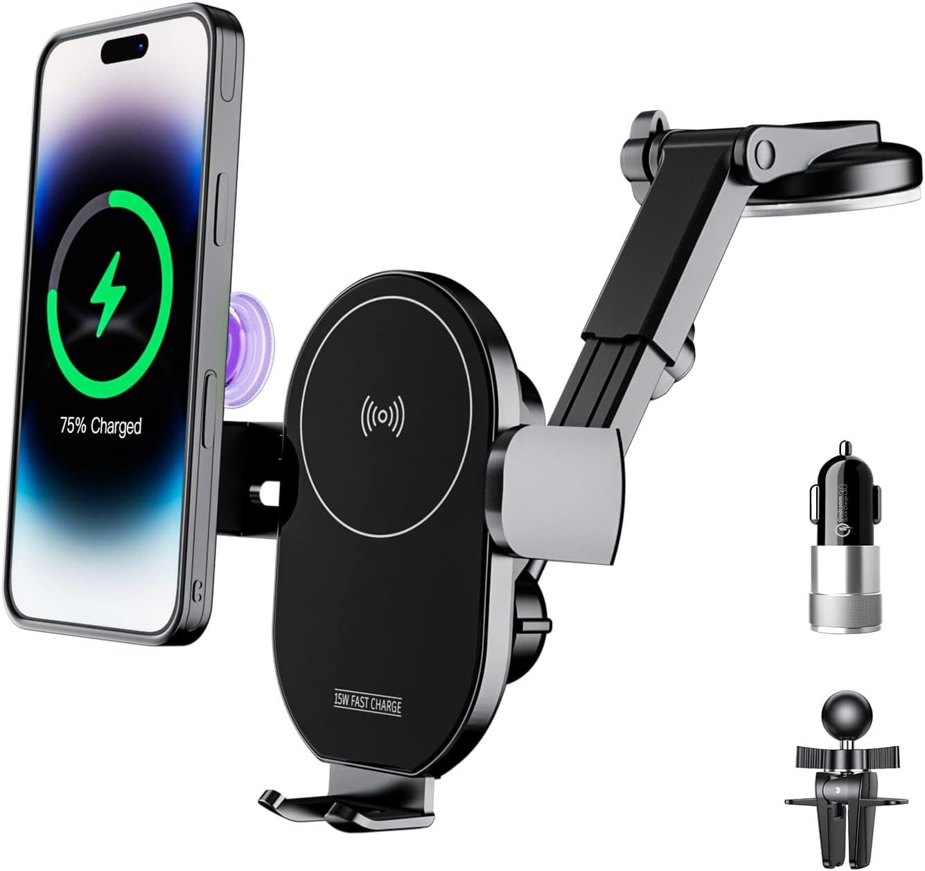 MAGJIEYX Support Telephone Voiture MagSafe, 15W Chargeur Induction Phone Voiture avec Adaptateur de Charge Rapide QC3.0 38W Compatible avec Les iPhone 16 15 14 13 12 Série