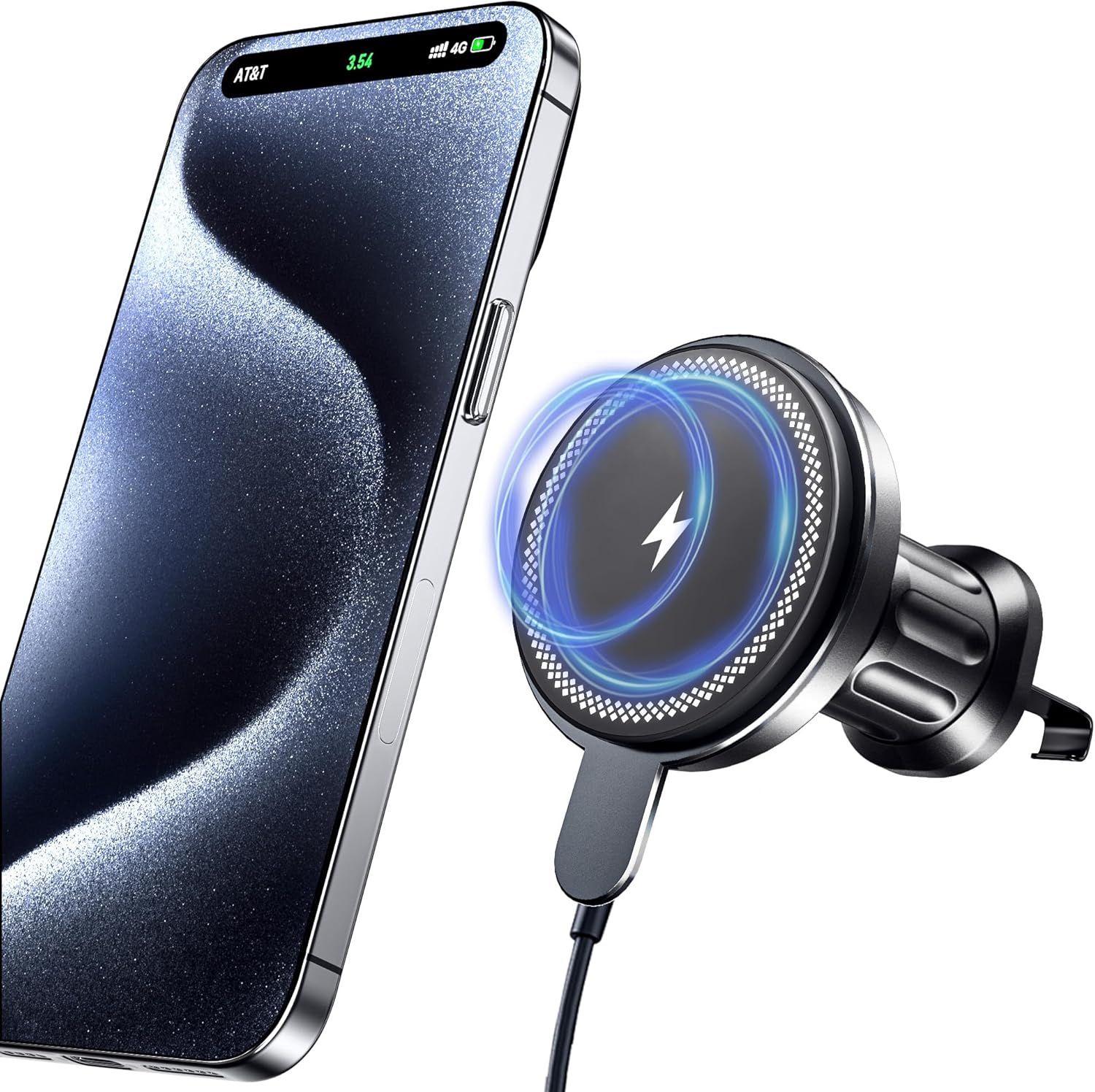 15W Chargeur Voiture pour Magsafe - Charge Rapide Support Téléphone Magnétique Voiture Induction, Qi2 Chargeur Telephone Air Vent Voiture sans Fil pour iPhone 16 Plus Pro Max 15 14 13 12 Mini