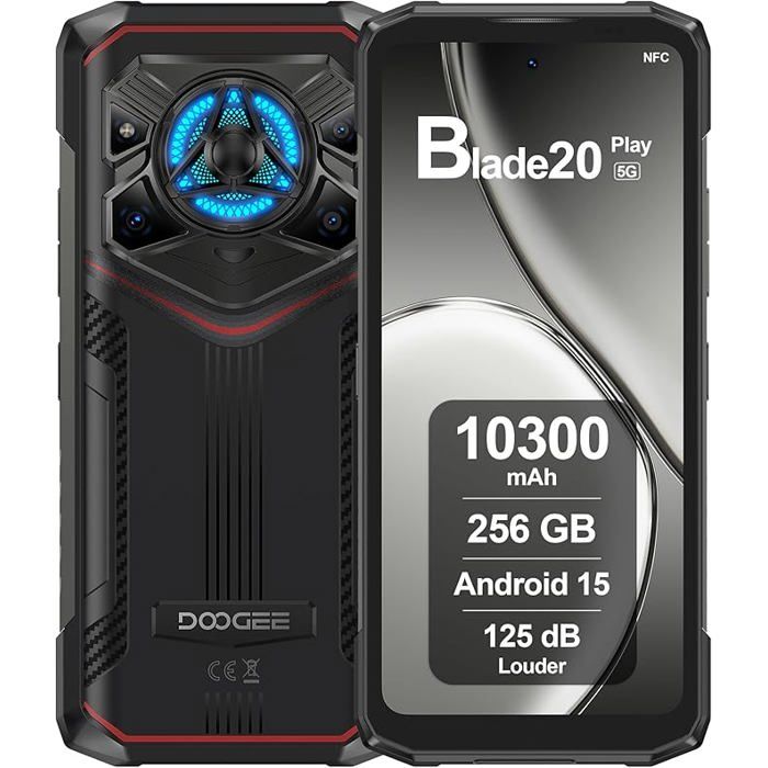 DOOGEE Blade 20 Play Telephone Portable Incassable 5G,32GB+256GB,10300mAh/33W,Smartphone Incassable Dimensity 7050,125dB Speakers, Effet Lumière LED,Smartphone Android 15,Caméra 50MP/WIFI6/NFC/Face ID
