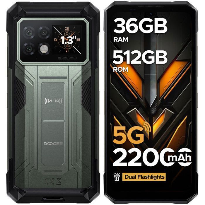 Doogee Fire 7 Pro 5G Telephone Portable Incassable 32Go+256Go 66 13000mAh Smartphone Robuste 64MP Double SIM/NFC/Face ID Vert