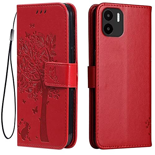 Topme Étui en Cuir pour Redmi A1 / Redmi A2 (6.52" inches), [ Coque Housse de Téléphone Style Motif Chat Et Arbre] - Rouge