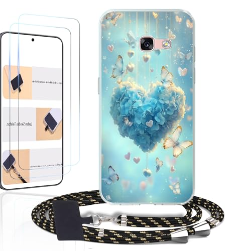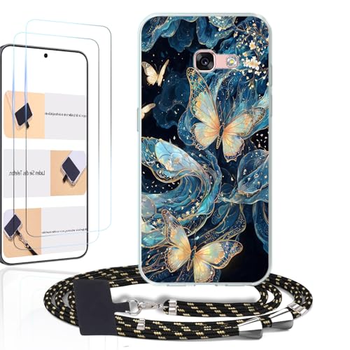 WUACYEAMING Coque pour Samsung Galaxy A3 (2017),avec Cordon & 2 Verre Trempé,Transparent Coque Collier Réglable Téléphone Étui Portable Lanyard CaseLoup à motifsPapillon à Motifs