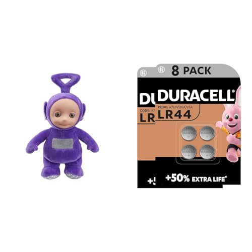 TeletubbiesCharacterUK8InchTalkingTinkyWinkySoftToy + Duracell Specialty LR44 Alkali-Knopfzelle 1,5 V, 8er-Packung (76A/A76/V13GA) entwickelt für die Verwendung in Spielsachen, Taschenrechnern und Mes