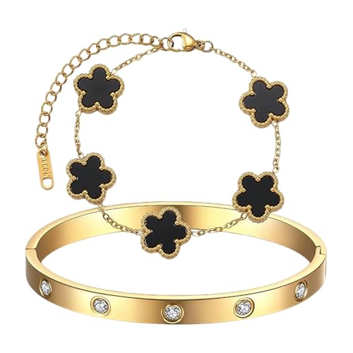 TenaLucy 2 Pièces Bracelet Trèfle À Cinq Feuilles,Ensemble de Bijoux Trèfle À Quatr, Feuilles bracelet trefle 4 feuilles Femme Bracelet Personnalisé pour Femme Apporte Plus de Chance (Noir + Or)