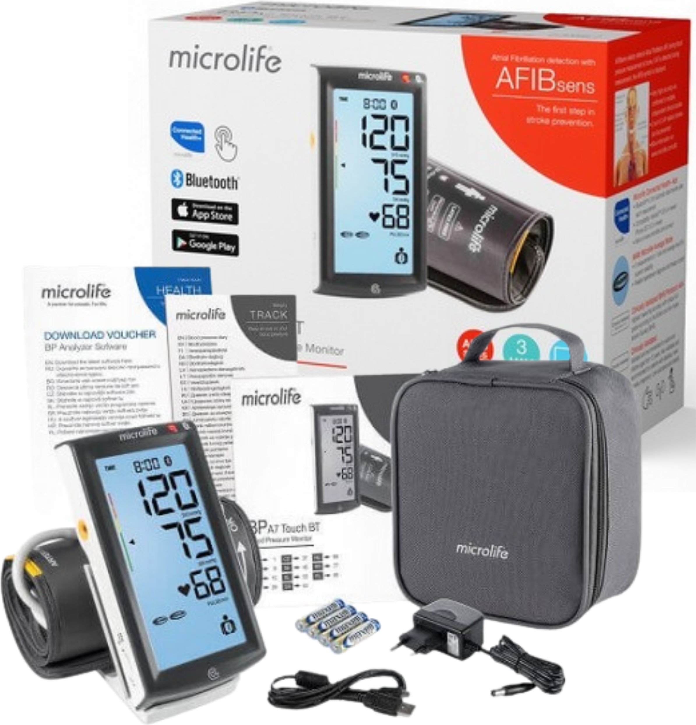 Microlife BP A7 Touch BT Tensiomètre à bras Bluetooth/USB MAM & AFIB Détection du risque d'accident vasculaire cérébral Testé cliniquement 22-42cm 2 utilisateurs x 99m