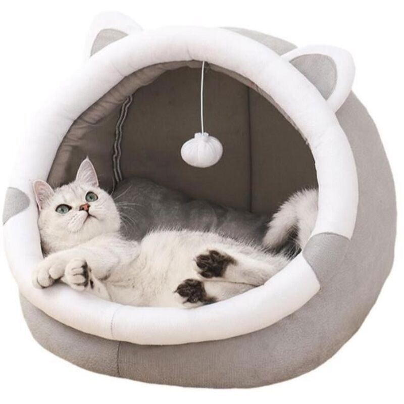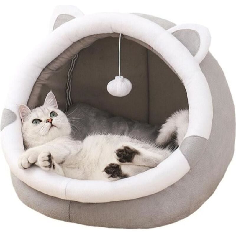 NatureMan Tente pour chat d'intérieur avec balle à suspendre, coussin en coton amovible, fournitures chaudes et douces pour chaton et petit chien (gris, M)