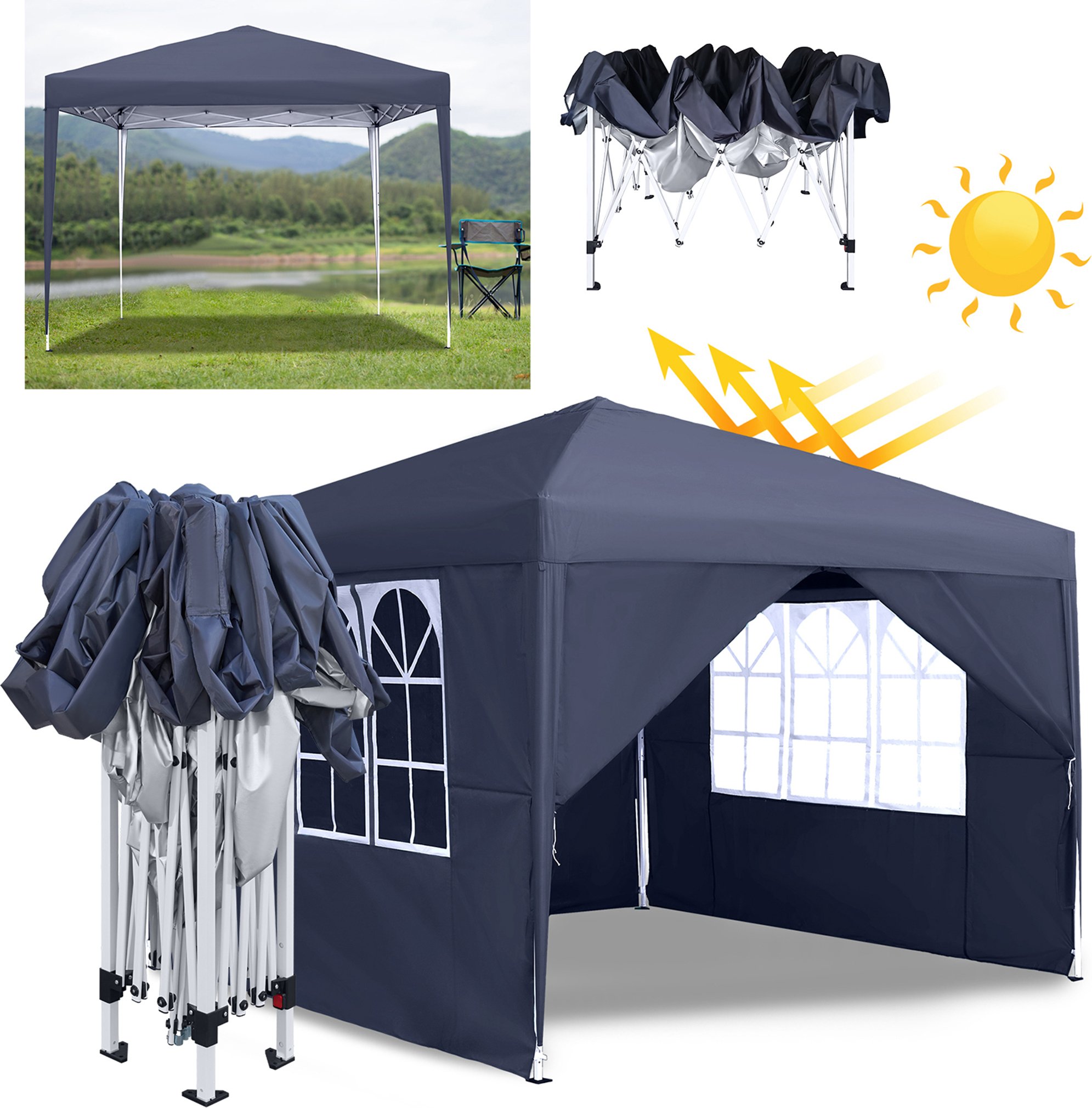 XMTECH Pavillon pliable 3x3 m imperméable Pavillon de jardin Tente de réception protection UV avec 4 parois latérales, tente de réception pour marché, jardin, cour, gris foncé
