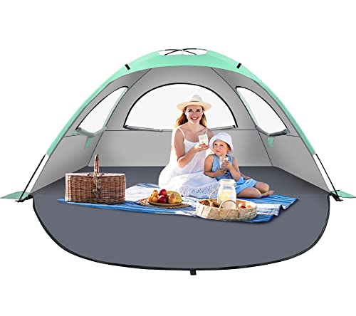 WhiteFang Deluxe XL Tente de Plage Pop-up pour 3 à 4 Personnes, Protection UV, Sol Extensible avec 3 fenêtres de Ventilation, Sac de Transport, piquets et haubans (Vert Menthe)