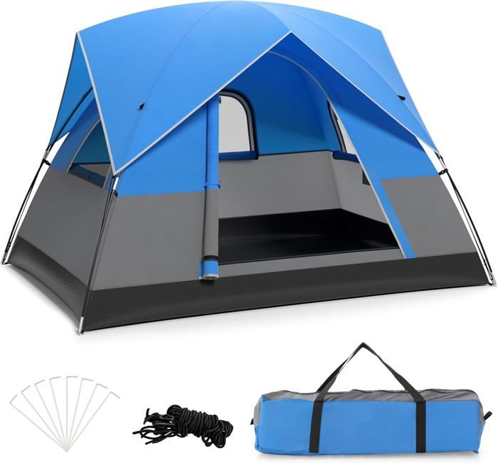 GOPLUS Tente de Camping Pop-Up pour 4-6 Personnes, avec Fixation Automatique, Double Couche & Double Toit, 2 Entrées &4 Fenêtres, Sac de Transport, Tente Familiale & Coupe-Vent pour Randonnées