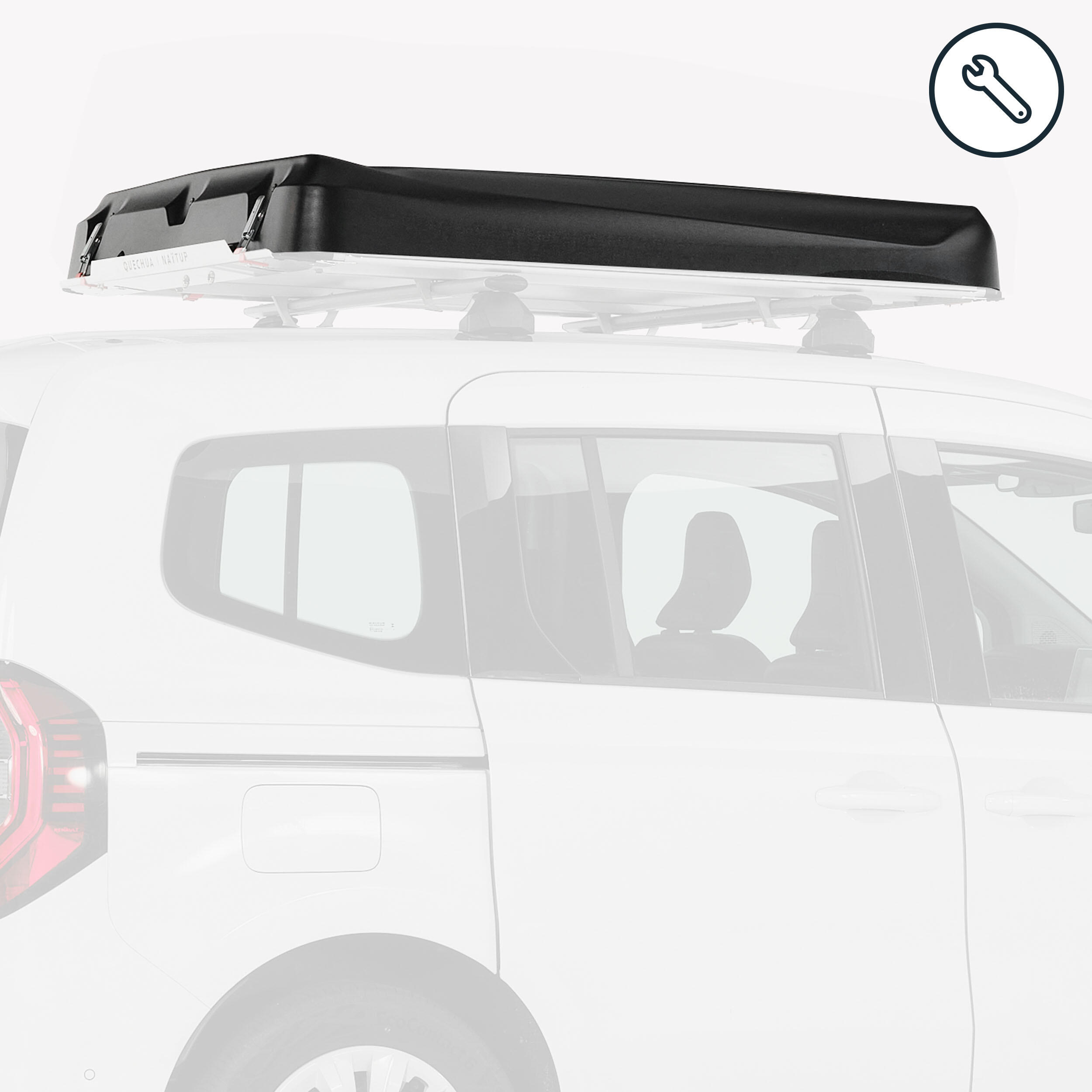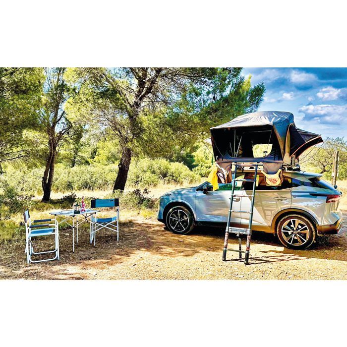 AdventureMate140 Tente de toit de voiture 140 x 240 cm avec entrée couverte ; avec auvent réglable en hauteur ; matelas de 60 mm, échelle télescopique, tapis anti-condensation ; tente de toit