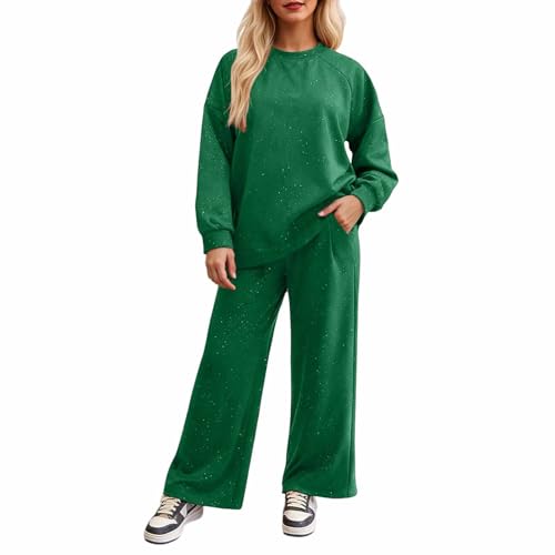 Nuqqichongtian Combinaison d'intérieur élégante à paillettes pour femme - Manches longues - Col rond - Haut et pantalon long - Tenue de loisirs - 2 pièces - Paillettes - Survêtement de loisirs - Vert