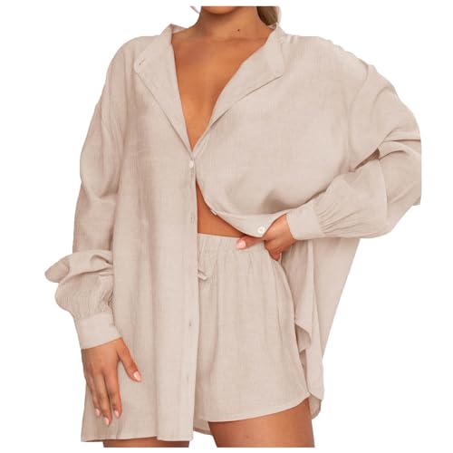 Ensemble en mousseline à manches longues pour femme - Décontracté - 2 pièces - Été - 2 pièces - Léger - Tenue de plage festive - Combinaison d'intérieur - Pour l'été - Loisirs - Haut et short - Pyjama