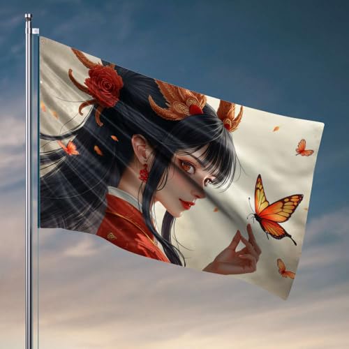 Drapeaux de chambre pour adolescentes, une femme en tenue traditionnelle avec papillons, décoration d'intérieur amusante, décorations d'automne d'extérieur (60 x 90 cm)