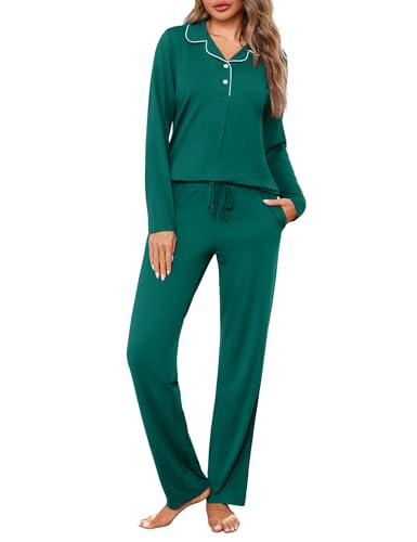 Jahetuul Ensemble Pyjama Femme Coton Confortable Longues Manches Col en V Haut Boutonné et Pantalon Uni avec Cordon Parfait pour Nuit et Tenue d'Intérieur