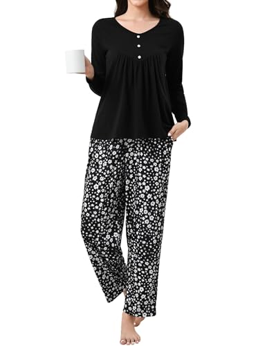Reliwel Pyjama Femme Hiver Pyjama Femme Coton Ensembles de Pyjama avec Impression à Manches Longues et Col V Pantalon à Poches Tenue d'Intérieur Hiver Doux Deux Pièces Noir M
