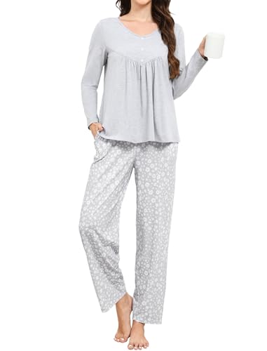 Reliwel Pyjama Femme Hiver Pyjama Femme Coton Ensembles de Pyjama avec Impression à Manches Longues et Col V Pantalon à Poches Tenue d'Intérieur Hiver Doux Deux Pièces Gris S