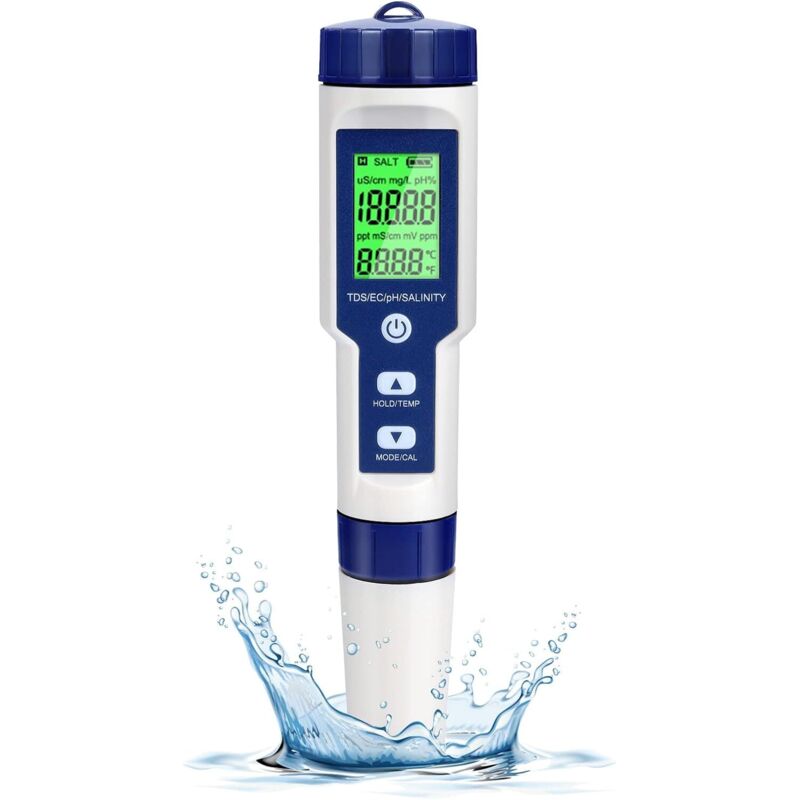Testeur ph Electronique, Testeur Eau Piscine 5 en 1 avec Rétro-éclairage, PH/TDS/EC/Salinité/TempmèTre avec atc, ph Metre Haute Précision de