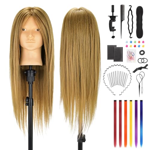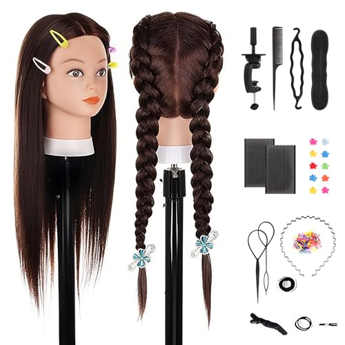 DanseeMeibr Tete a Coiffer, 66cm Tête de coiffure 100% de Cheveux Synthétiques Têtes d'exercice pour le Salon Coiffeur Poupée avec Support + Ensemble de Tresse