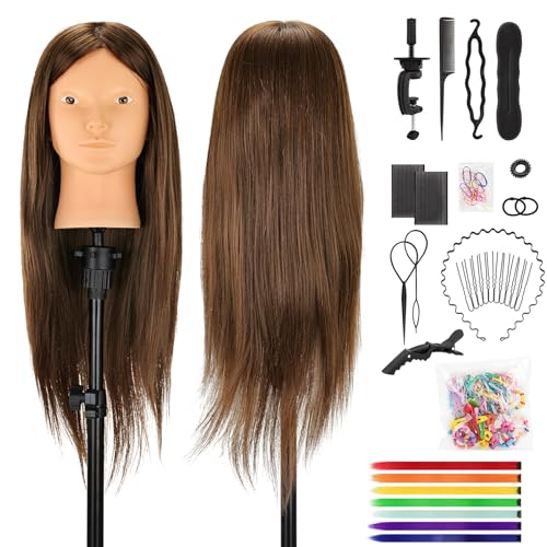 Neverland 71cm Tete a Coiffer Professionnelle Tete a Maquiller avec 60% Cheveux Humains, Tête de Coiffure Maquillage Tête d'entraînement avec Outils de Coiffure, Cils et Pince de Table(Brun foncé)