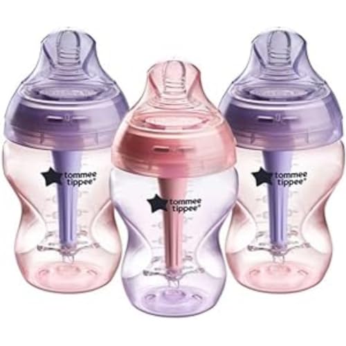 Tommee Tippee Lot de 3 biberons anti-coliques avancés, 260 ml, tétine à débit lent pour un loquet naturel, triple aération anti-colique, violet/rose