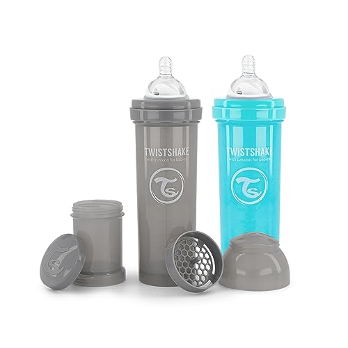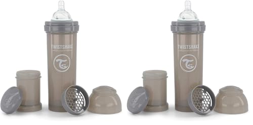 Twistshake Biberon Anti-Colique 330 ml avec Récipient à Lait en Poudre et Mélangeur – Tétine en Silicone Débit Rapide – Sans BPA – Idéal pour Bébé dès 4 Mois – Gris (Lot de 2)