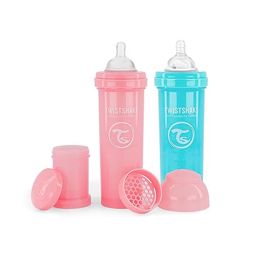 2x Twistshake Biberon en Plastique avec Valve Anti Colique, Tétine Souple en Silicone Débit Vite, Donner le Biberon avec Tétine en Forme de Sein, 330 ml, 4 Mois et +, Rose Pastel & Bleu Pastel