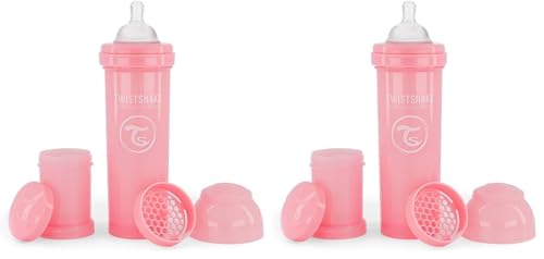 Twistshake Biberon Anti-Colique 330 ml avec Récipient à Lait en Poudre et Mélangeur – Tétine en Silicone Débit Rapide – Sans BPA – Idéal pour Bébé dès 4 Mois – Rose (Lot de 2)