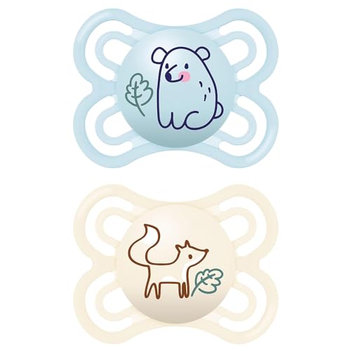 MAM Lot de 2 tétines originales en silicone MAM SkinSoft, respectueuses des dents, en matériaux durables et bio-renouvelables, avec boîte à tétine, pour bébé de 6 à 16 mois, motifs : ours, renard