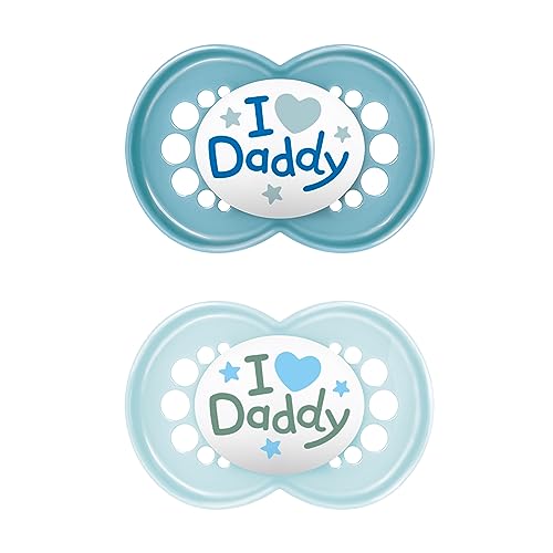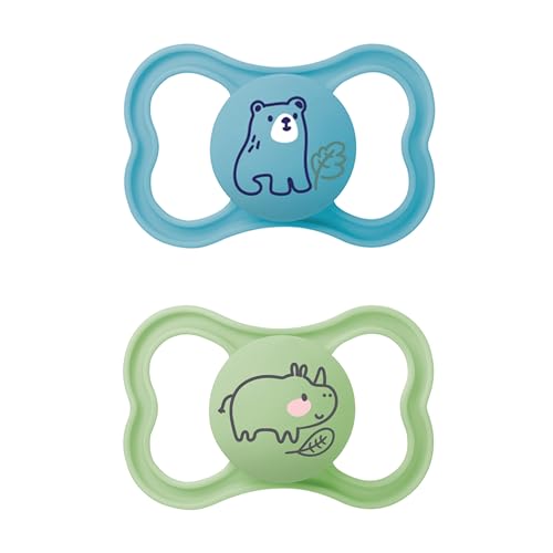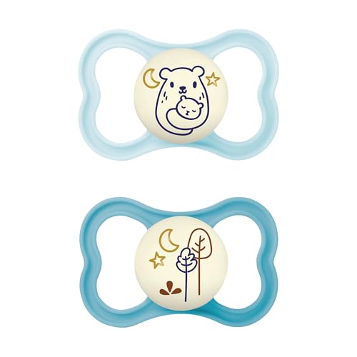 MAM MAM Air Lot de 2 tétines avec bouclier ventilé qui brille dans le noir, à partir de 16 mois, avec tétine symétrique, plate et flexible, facile d'acceptation, avec boîte auto-stérilisante, bleu mat