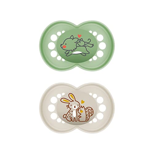 MAM Lot de 2 tétines originales en silicone MAM SkinSoft, respectueuses des dents, en matériaux durables et bio-renouvelables, avec boîte à tétine, pour bébé de 16 mois et plus, motif : loup et lapin