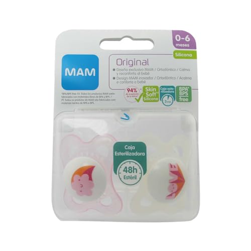 MAM MAM Original Lot de 2 tétines symétriques, plates et flexibles en silicone Skin Soft Silicone facile d'acceptation avec boîte auto-stérilisatrice, rose brillante, 2 à 6 mois